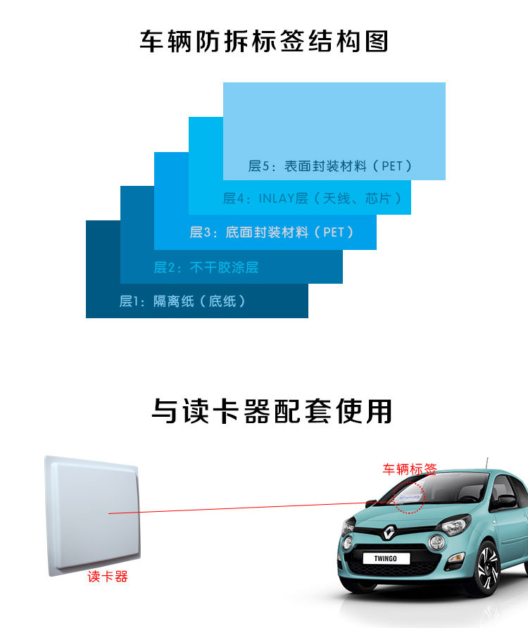 产品介绍:RFID挡风玻璃防拆标签 9654超高频纸质标识卡 防撕标签 带刀口